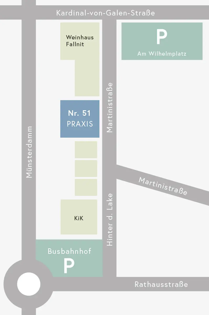 Unsere Praxis liegt zentral in Greven und ist leicht zu erreichen. Parkplätze sind in der näheren Umgebung ausreichend vorhanden.